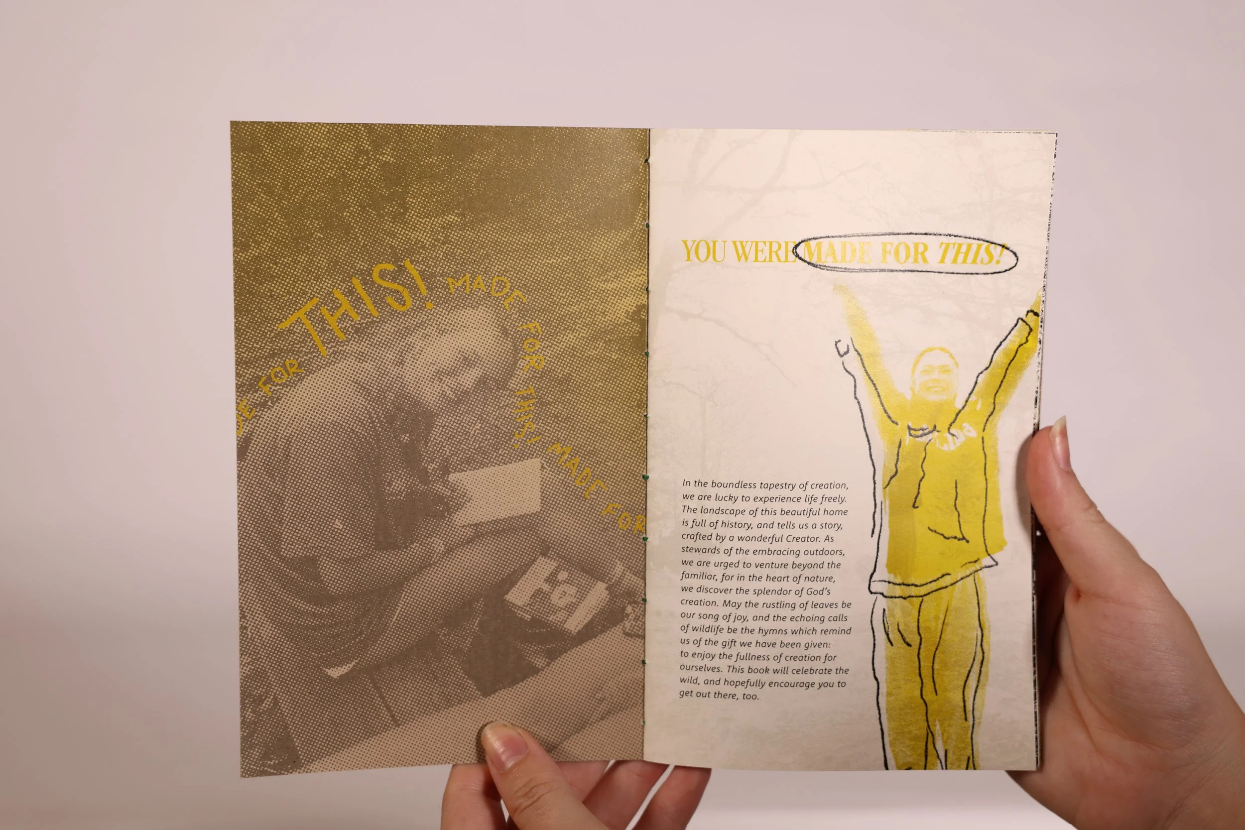 You Were Made for This! is a 24 page experimental zine that is a celebration of the wild and an invitation to explore. The first few spreads walk through the beauties of the wilderness, explaining the draw of humans to the wild, while the rest of the zine encourages the reader to explore everything that’s out there.