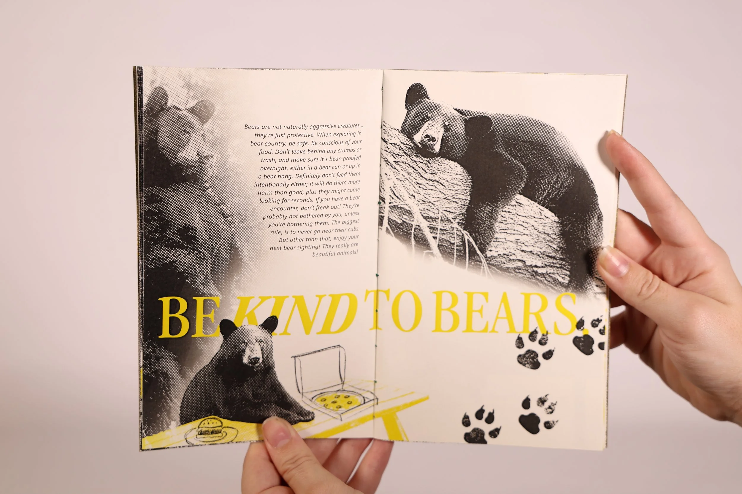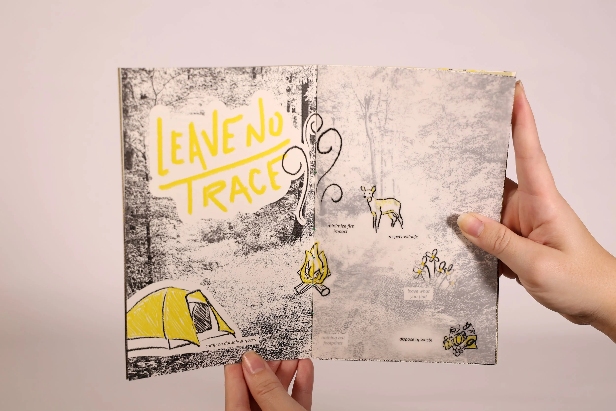 In this zine, I experimented with paper, using two different kinds of 100% recycled paper, as well as clear vellum. The zine takes a grunge twist on the aesthetic of traditional outdoors magazines, using hand drawn illustrations and half tone aesthetics.